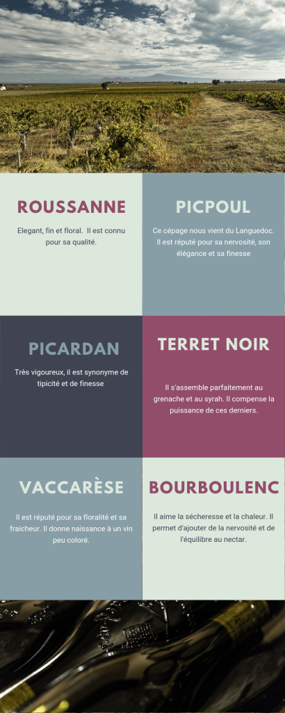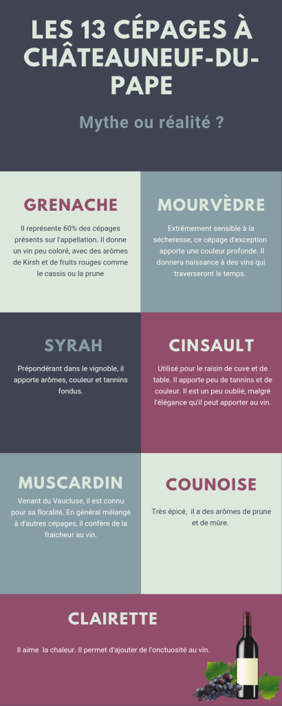 Voici les principaux cépages présents sur le vignoble de Châteauneuf-du-Pape. Si vous êtes curieux d’en savoir plus sur la région et ses spécificités, c’est par ici !